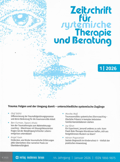 Die neue Ausgabe 1/2026 der Zeitschrift für systemische Therapie und Beratung ist kürzlich erscheinen. Die Fachbeiträge drehen sich diesmal rund um das Thema "Trauma: Folgen und der Umgang damit - unterschiedliche systemische Zugänge".
