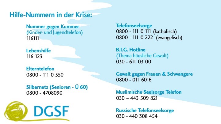 - Gemeinsam stark durch die Krise! Psychologische Unterstützung – kostenlos und anonym: Telefon 0800 000 33 45 * (täglich 8 – 20 Uhr: mehr Infos: https://starkdurchdiekrise.de