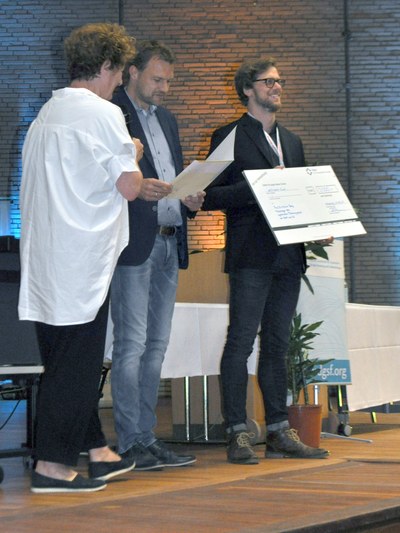 Dr. Ulrike Borst (Systemische Gesellschaft) und Dr. Björn Enno Hermans überreichen den Systemischen Forschungspreis an Mathias Berg